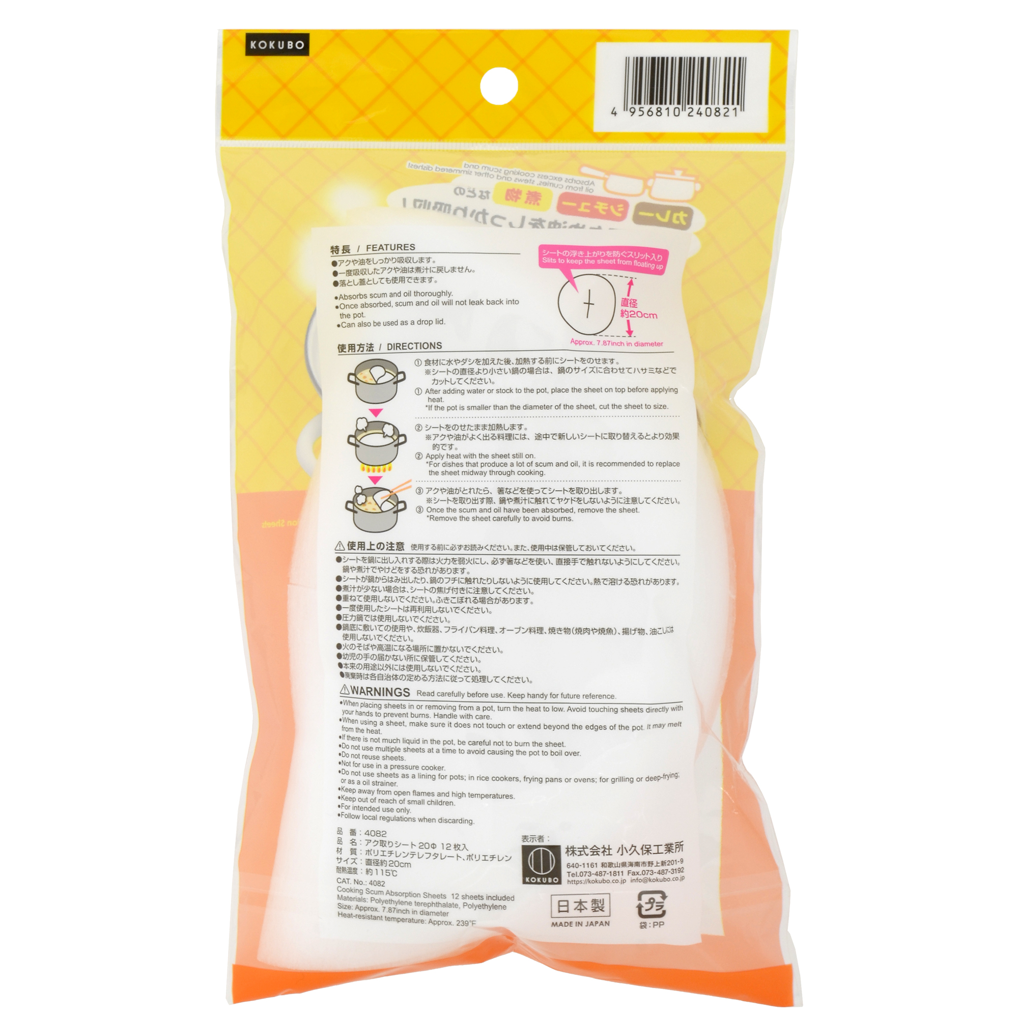 煮込み料理に便利なアク取りシートです。サイズは直径20cm 12枚入と、22cm 10枚入の2種類。