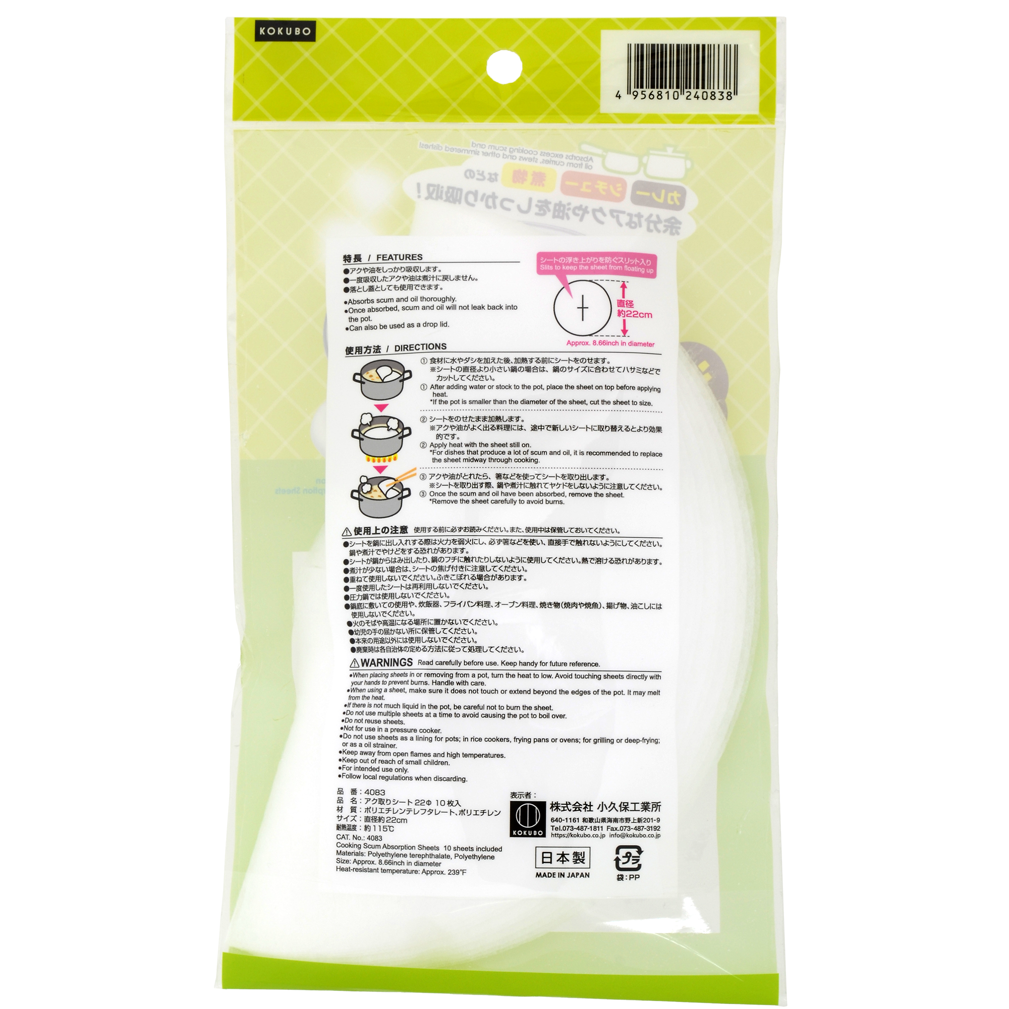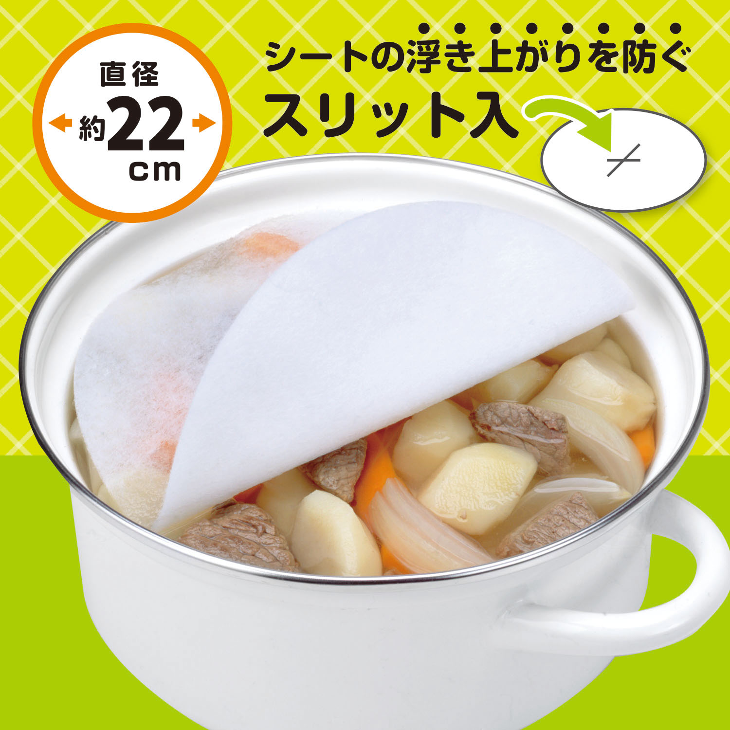 煮込み料理に便利なアク取りシートです。サイズは直径20cm 12枚入と、22cm 10枚入の2種類。
