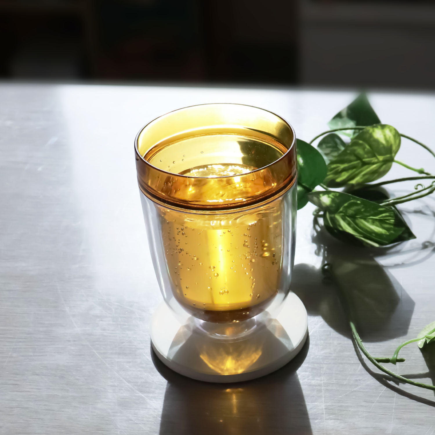 ◎グラスが二重構造になっていて、熱が伝わりにくく、結露しにくい。