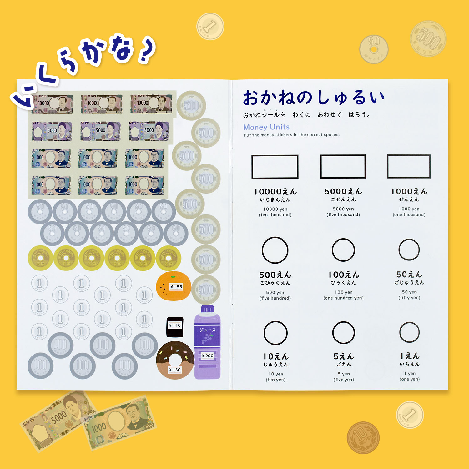 ◎”いくらかな?“ お金について、シールで遊んで学べます。