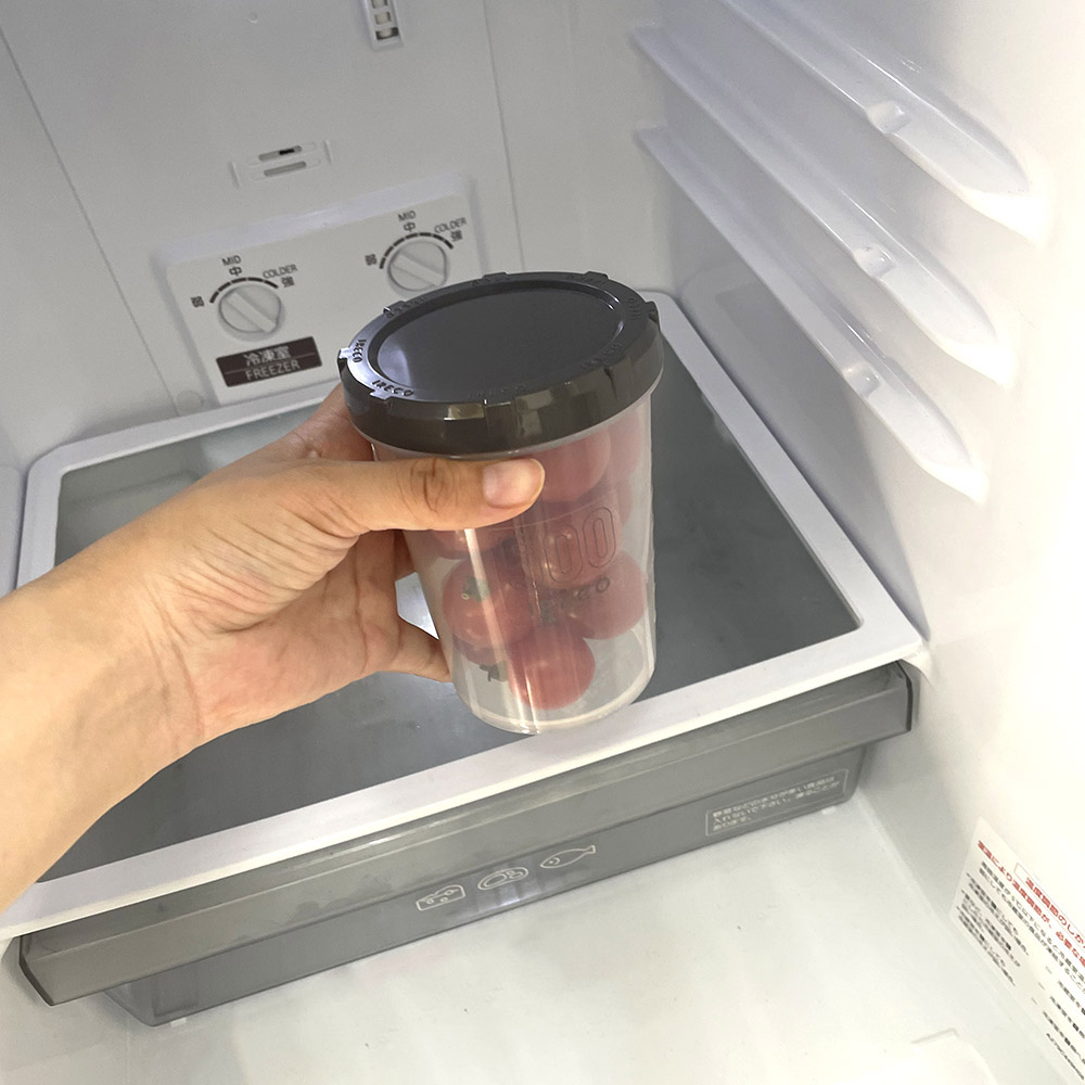 ポリプロピレン製の半透明容器にダークグレーのフタがついたシンプルな食品保存容器です。底がややすぼまった円筒形で縦長タイプ。サイズはS(500mL)、M(1000mL)、L(1500mL)の3サイズがあり、容器の側面に容量が書いてあります。フタをした状態で入れ子にして収納できることから、「IRECO」と名付けました。使わないときは省スペースでしまえるのが特長です。フタの周囲に滑り止めの凹凸があり、開閉しやすくなっています。フタをまわして閉めるタイプで、モレにくい作りです。(完全密閉ではありません) 100mL、5oz間隔の目盛り付きで計量に便利。S、M、L単品と、3個セットがあります。