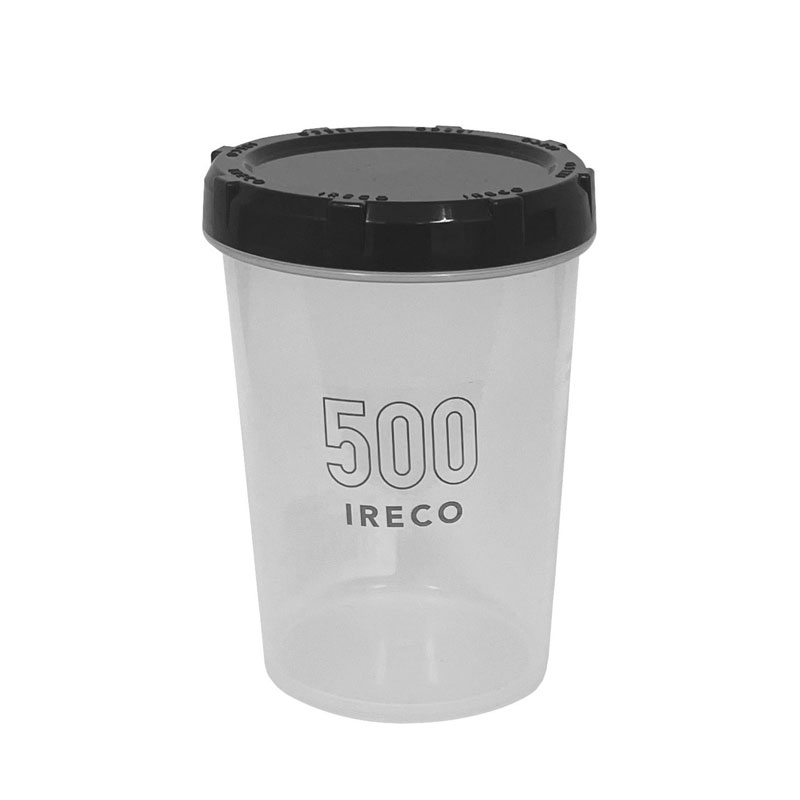 ポリプロピレン製の半透明容器にダークグレーのフタがついたシンプルな食品保存容器です。底がややすぼまった円筒形で縦長タイプ。サイズはS(500mL)、M(1000mL)、L(1500mL)の3サイズがあり、容器の側面に容量が書いてあります。フタをした状態で入れ子にして収納できることから、「IRECO」と名付けました。使わないときは省スペースでしまえるのが特長です。フタの周囲に滑り止めの凹凸があり、開閉しやすくなっています。フタをまわして閉めるタイプで、モレにくい作りです。(完全密閉ではありません) 100mL、5oz間隔の目盛り付きで計量に便利。S、M、L単品と、3個セットがあります。