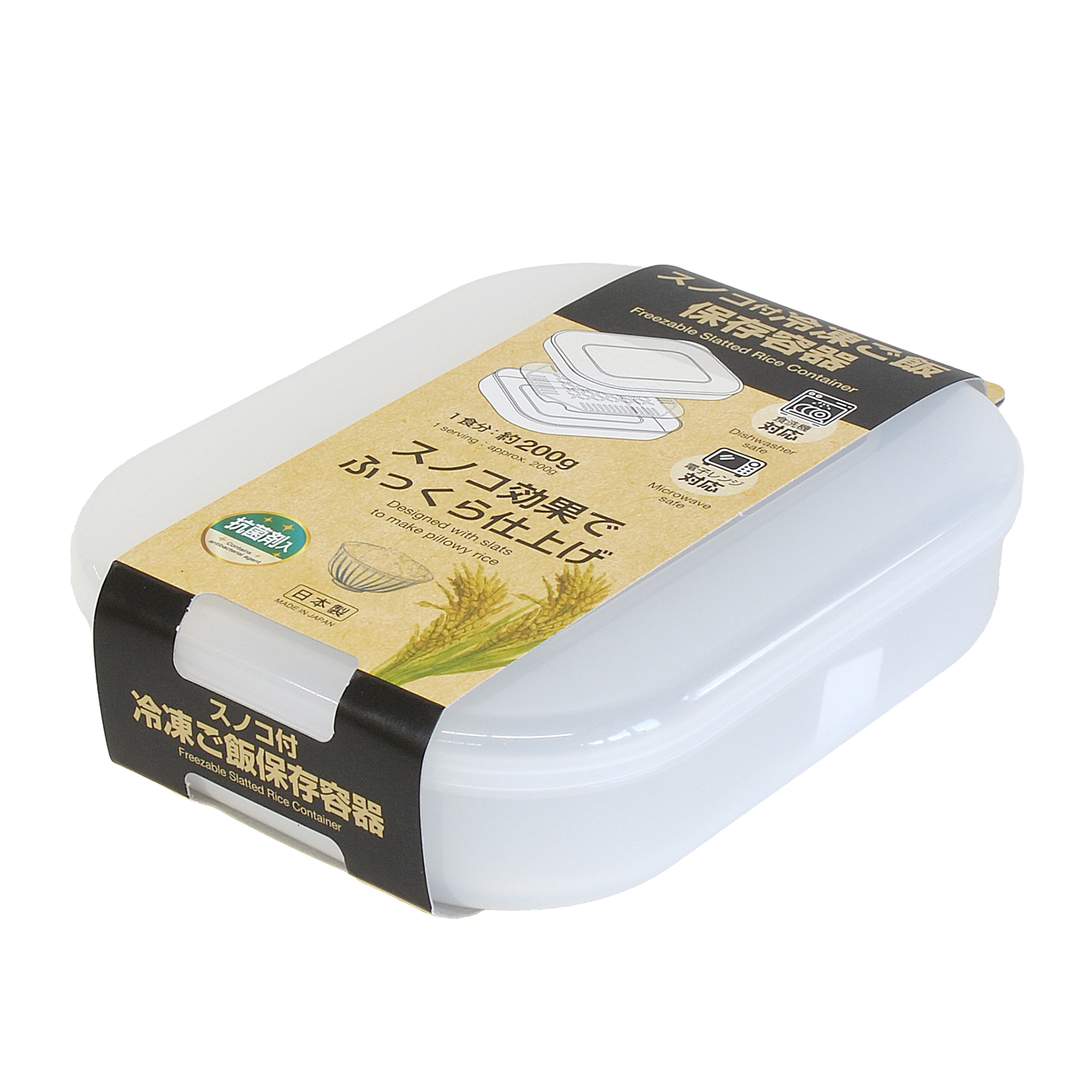 本品はポリプロピレン製の容器、スノコ、フタのセットで、ご飯を機能的に冷凍保存し、おいしく加熱するのに適しています。ご飯を保存するときは、容器にスノコを敷いてご飯を入れます。スノコは約2mmの高台付きで、米粒よりも細い穴が、多めに、バランスよく空いています。ご飯のベタつきをおさえ、レンジ加熱すると蒸し器のようにふっくらと仕上げることができます。約3.8cmの薄型なので均一に温められます。半透明の容器で中が見えること、スノコの指穴、フタのツマミ、薄くて収納しやすいこと、積み重ねられること、食洗機OKなど、シンプルながら使いやすい工夫が盛り込まれています。