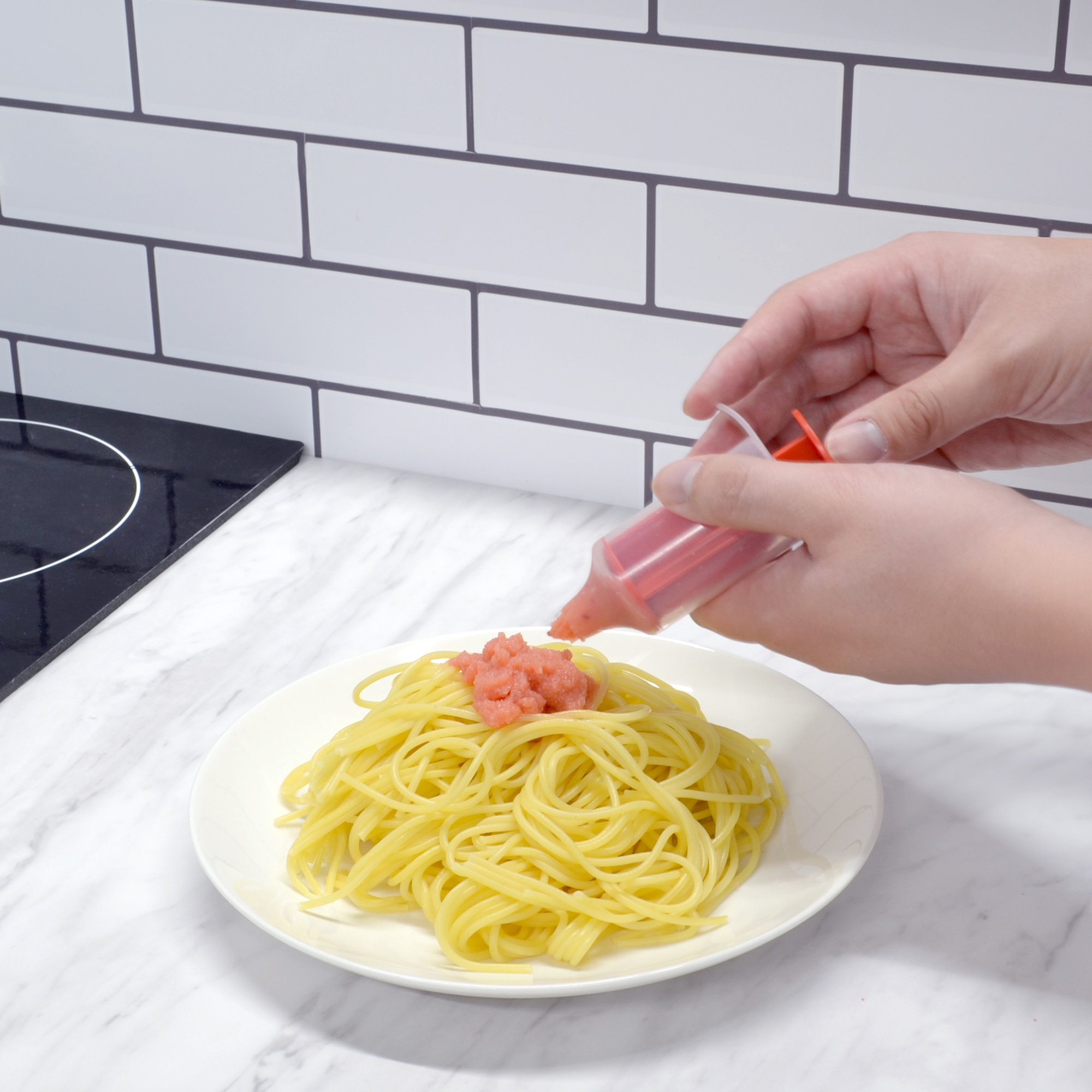 ◎薄皮がついたたらこ・明太子の中身を、ペースト状に押し出せる、注射器のような形のグッズ。