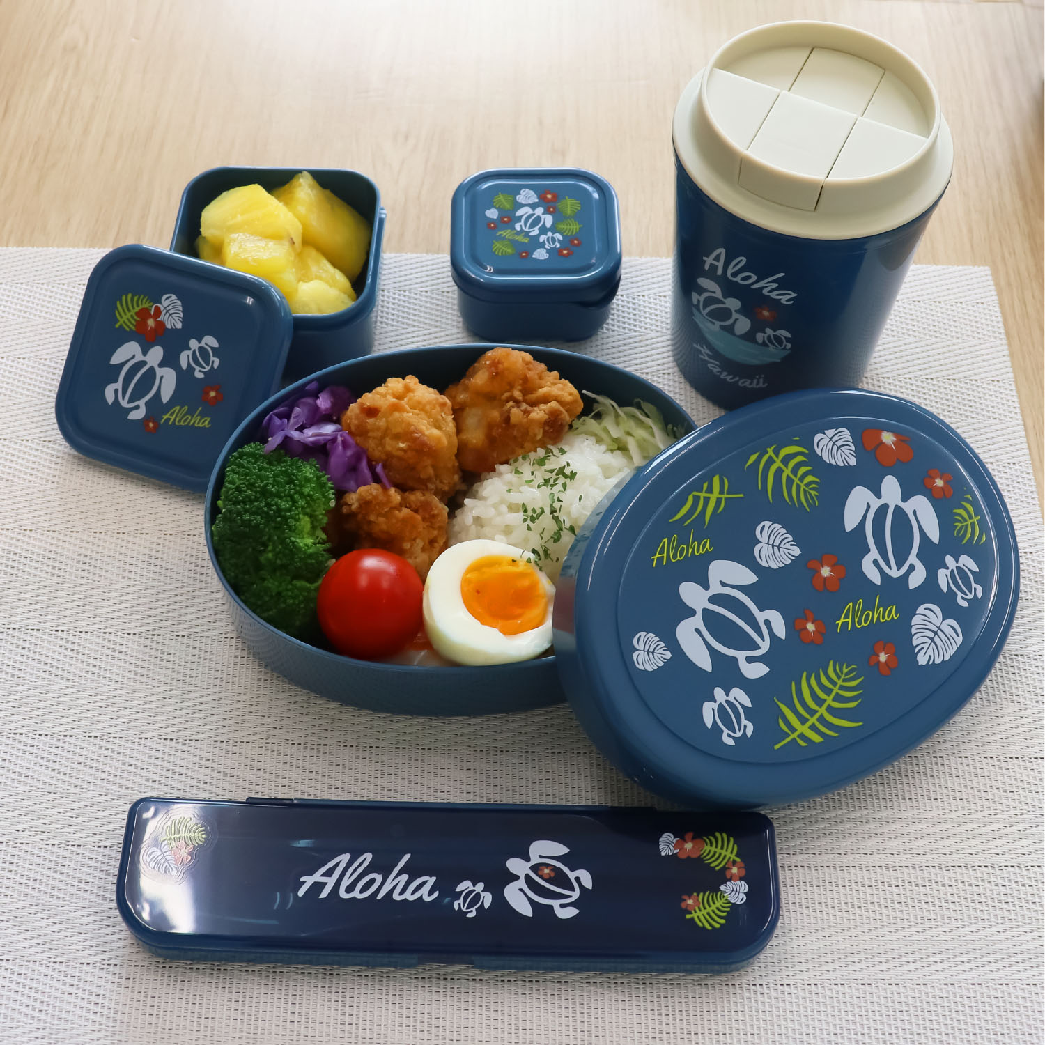 ◎ハワイホヌ柄、アロハパインのイラスト付き。ハワイ風の明るいトロピカルな絵柄で、楽しいランチタイムを。