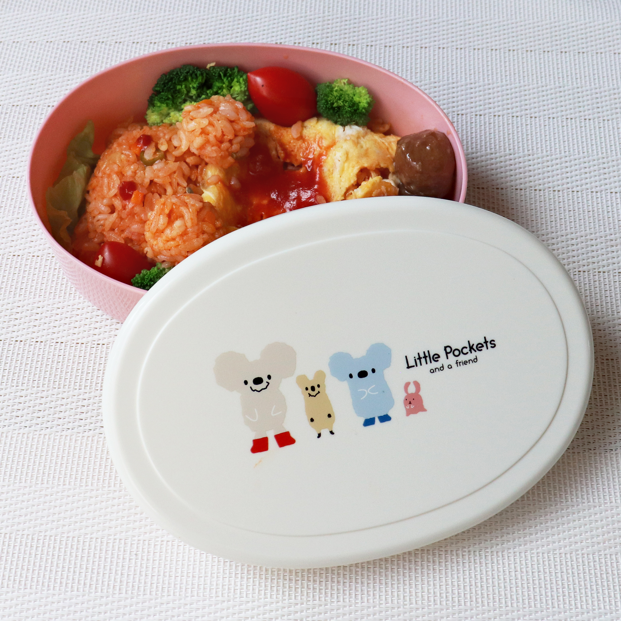 ◎Little Pockets and a friendのイラスト付き。ほっこり和む仲良しキャラで、お弁当タイムを楽しく。