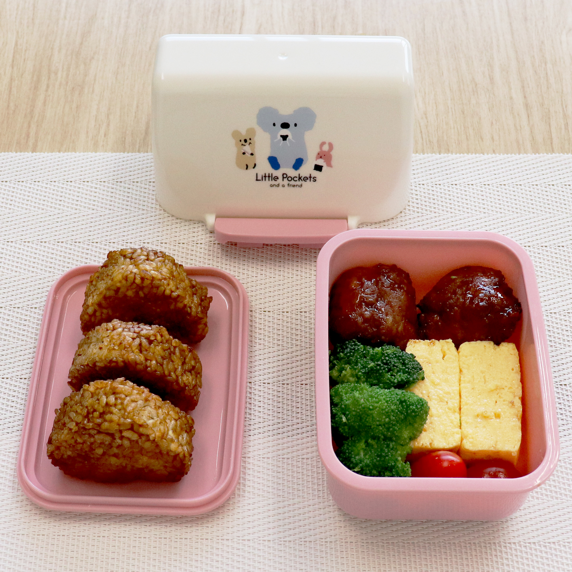 ◎Little Pockets and a friendのイラスト付き。ほっこり和む仲良しキャラで、お弁当タイムを楽しく。
