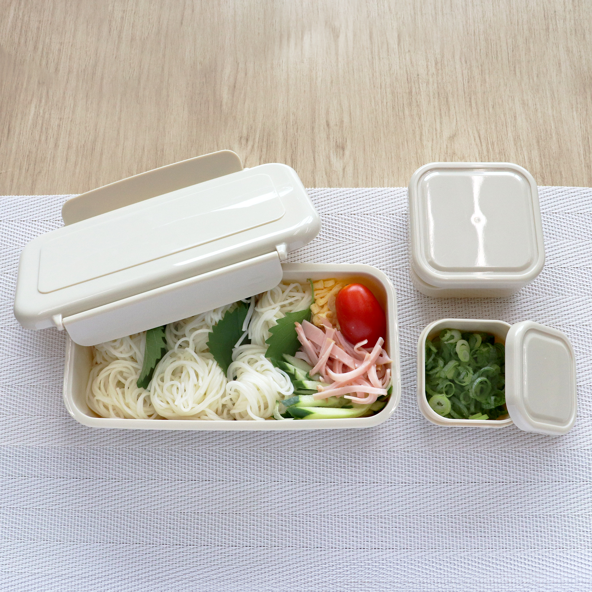 ランボックス500mLにそうめんを、スクエアボックスS・Lに薬味などを入れてランチに。