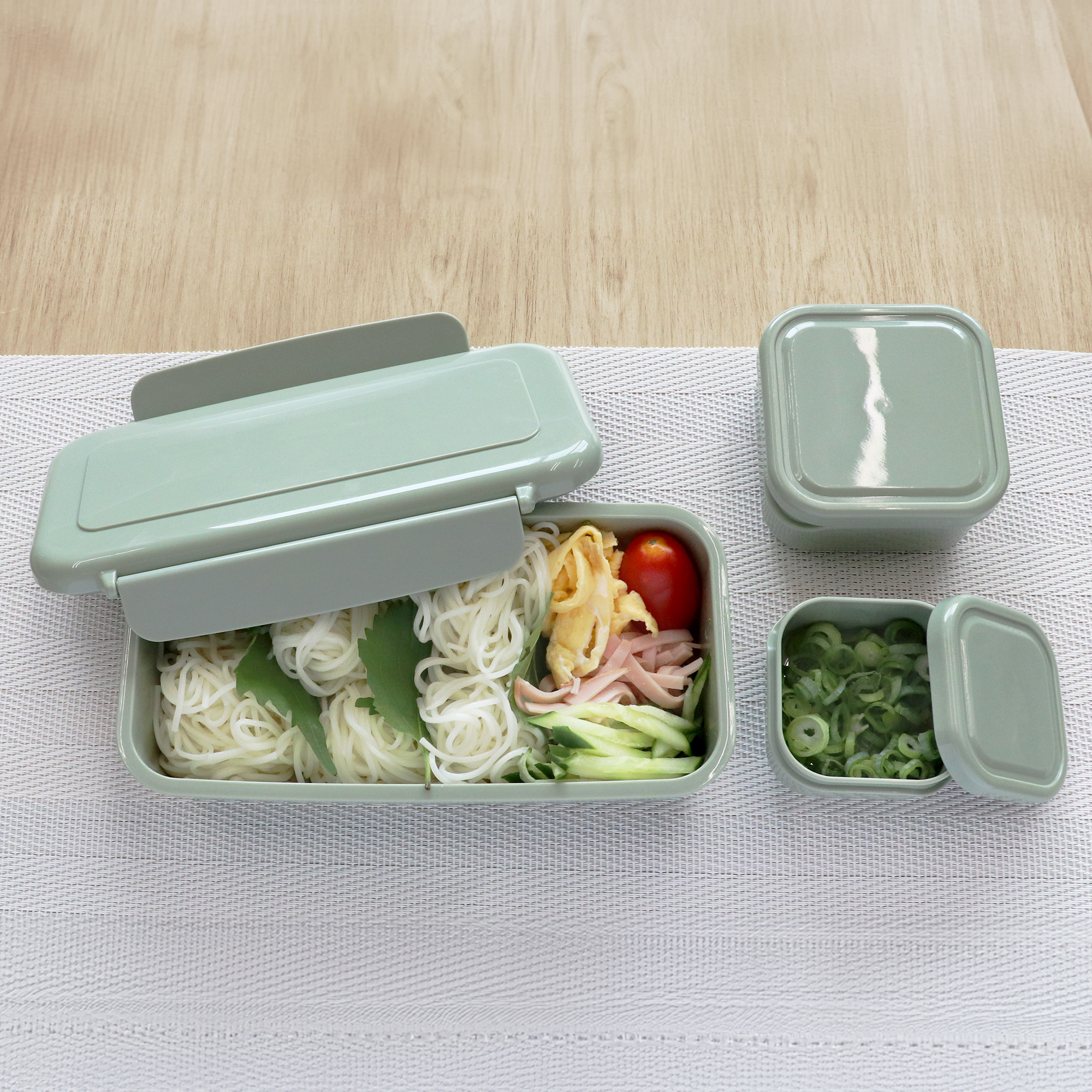 ランボックス500mLにそうめんを、スクエアボックスS・Lに薬味などを入れてランチに。